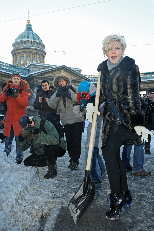 Женское движение XZ из Санкт-Петербурга устроило перформанс из уборки снега перед Казанским собором. Таким образом девушки намеревались привлечь в город больше иностранных туристов и обратить внимание общественности на проблемы с очисткой питерских улиц ото льда и снега.